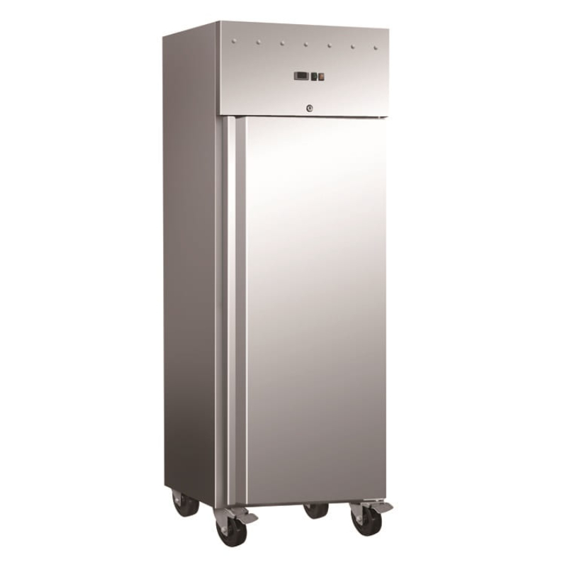 Fabricado íntegramente en acero inoxidable, este armario garantiza la máxima higiene, resistencia a la corrosión y una limpieza sencilla, cumpliendo con los más altos estándares de la industria. Su potente sistema de enfriamiento ventilado es una característica clave, ya que asegura una distribución de aire frío homogénea en todo el interior, manteniendo una temperatura constante en el rango de -18 ºC a -22 ºC para una perfecta conservación por congelación.