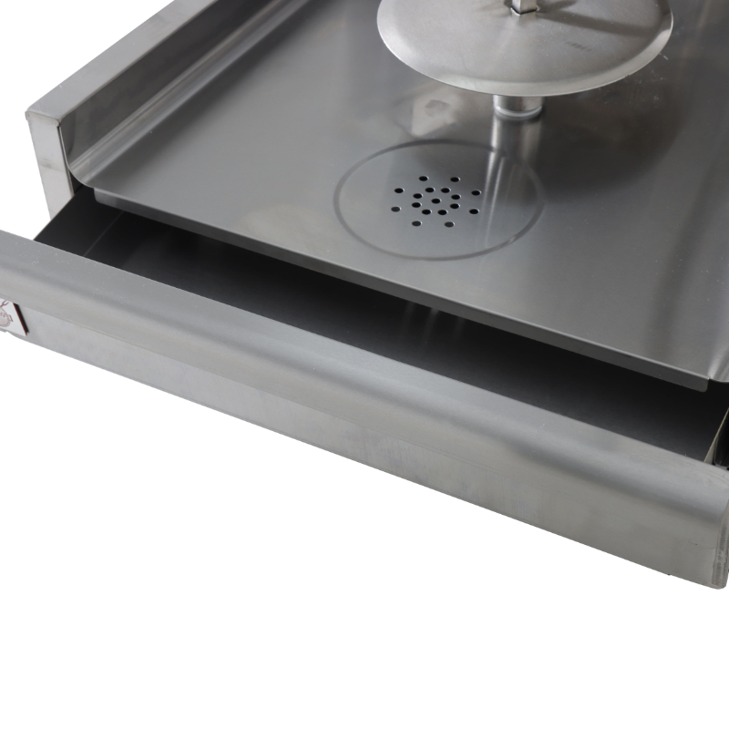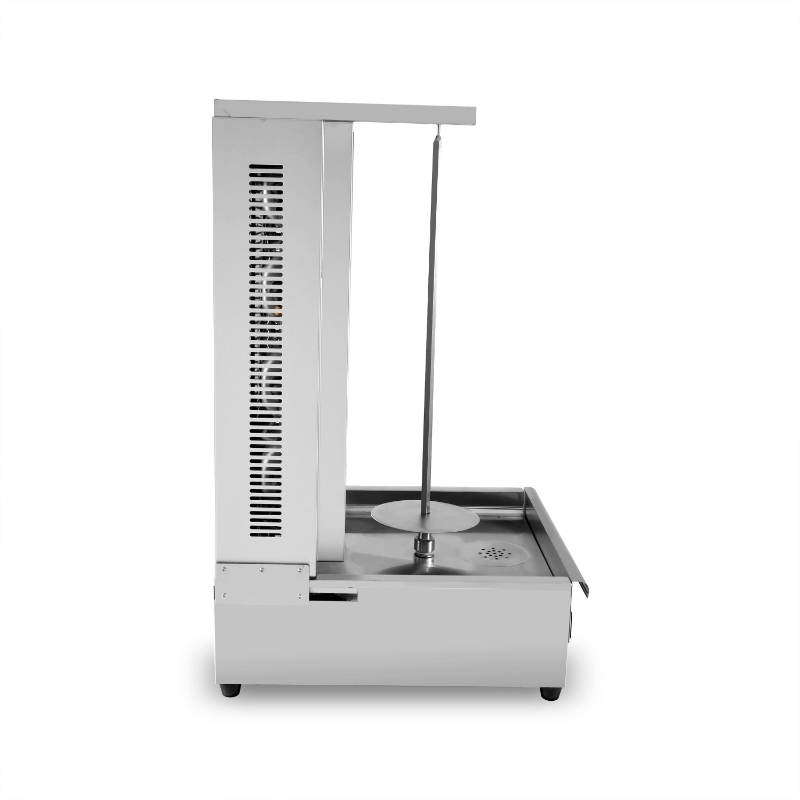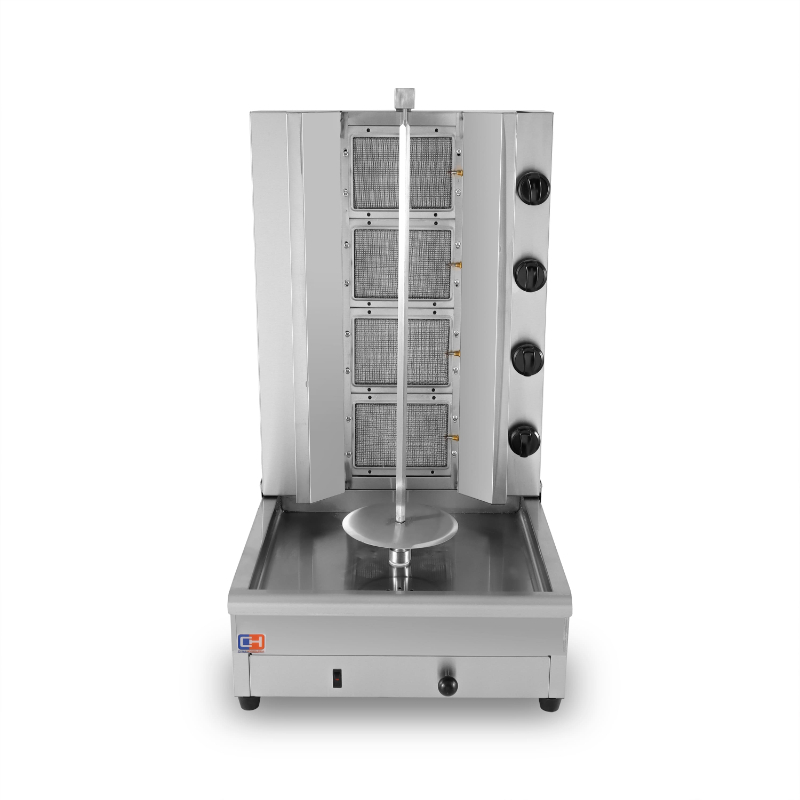 El Asador Kebab a Gas Pekín GSG-950 es un equipo profesional de la serie económica, diseñado para ofrecer gran fiabilidad a un precio competitivo. Su estructura, pincho y plato de carne están fabricados en acero inoxidable, lo que facilita su limpieza y asegura durabilidad. El asador cuenta con 4 quemadores de gas con rejilla protectora de acero inoxidable y piedras cerámicas de alta resistencia, cuya temperatura se puede regular de forma individual. La espada es ajustable para adaptarse a diferentes tamaños de carne. Un motor protegido y de larga durabilidad, ubicado en la parte inferior, permite el giro de la espada en ambos sentidos. Viene preparado de serie para gas butano/propano e incluye los inyectores necesarios para el cambio a gas natural. La bandeja de goteo extraíble también está hecha de acero inoxidable, lo que facilita la limpieza de todas las piezas que entran en contacto con los alimentos.