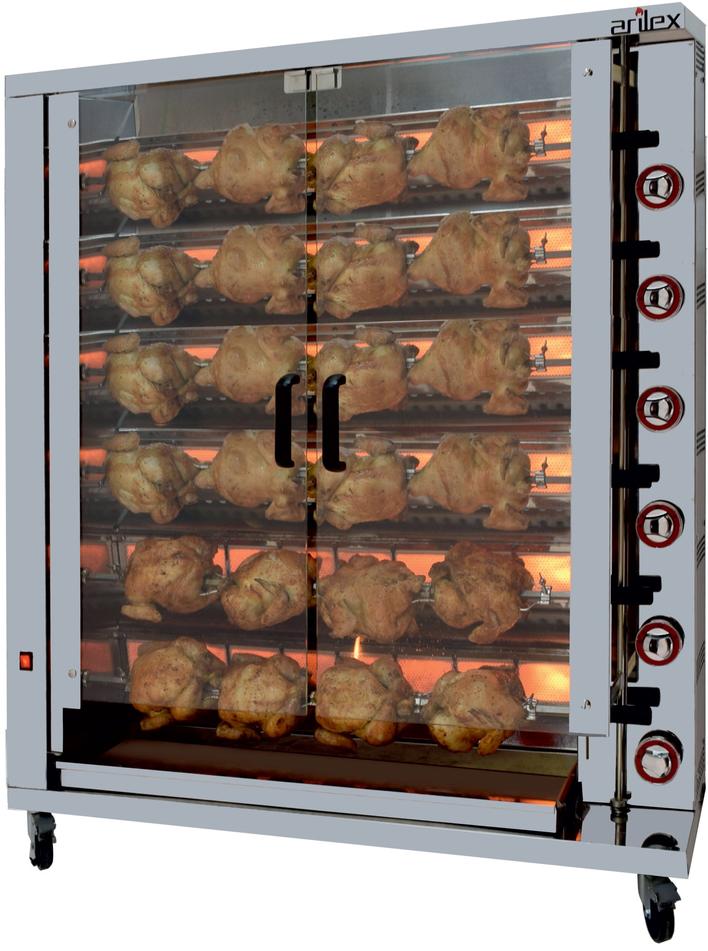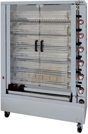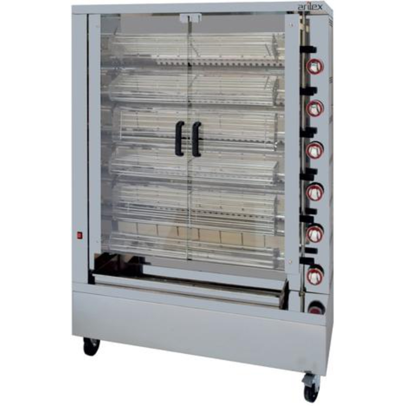 Este asador está diseñado para la máxima eficiencia, gracias a un sistema de transmisión por cadena y engranajes de alta calidad que asegura un movimiento suave y continuo, y a unos soportes de espada que minimizan la pérdida de calor. Cuenta con seis quemadores independientes de gran poder calorífico, cada uno equipado con un termopar de seguridad, lo que permite un control preciso de la cocción y un funcionamiento seguro. La chapa entre los quemadores es fácilmente desmontable para una limpieza sin complicaciones. La bandeja inferior de gran capacidad recoge de manera eficiente los jugos y grasas, y las puertas de cristal templado con cierre magnético ofrecen una visión clara del asado. El asador se suministra predispuesto para gas butano-propano y se incluyen inyectores para su conversión a gas natural, garantizando su adaptabilidad. El 6ASGP es la elección ideal para profesionales que buscan un equipo de alto rendimiento, seguro y fácil de mantener.