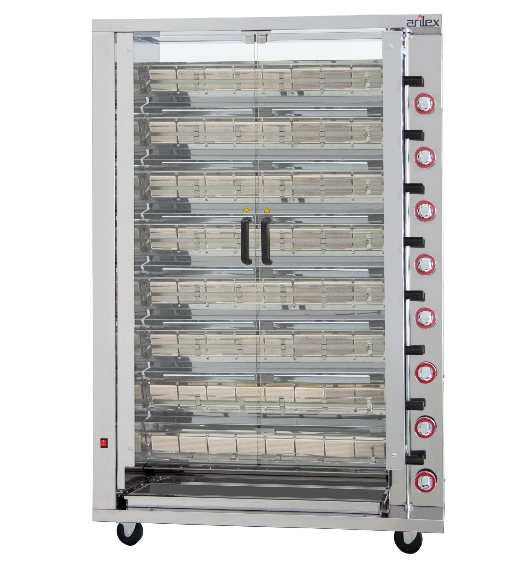 Este asador está diseñado para la máxima eficiencia, gracias a un sistema de transmisión por cadena y engranajes de alta calidad que asegura un movimiento suave y continuo, y a unos soportes de espada que minimizan la pérdida de calor. Cuenta con ocho quemadores independientes de gran poder calorífico, cada uno equipado con un termopar de seguridad, lo que permite un control individualizado de la temperatura y un funcionamiento seguro. La chapa entre los quemadores es fácilmente extraíble para una limpieza sin complicaciones. La bandeja inferior de gran capacidad recoge de manera eficiente los jugos y grasas, y las puertas de cristal templado con cierre magnético ofrecen una visión clara del asado. El asador se suministra predispuesto para gas butano-propano, e incluye inyectores para su conversión a gas natural, garantizando su adaptabilidad. El 8ASGP es la elección ideal para profesionales que buscan un equipo de alto rendimiento, seguro y fácil de mantener.