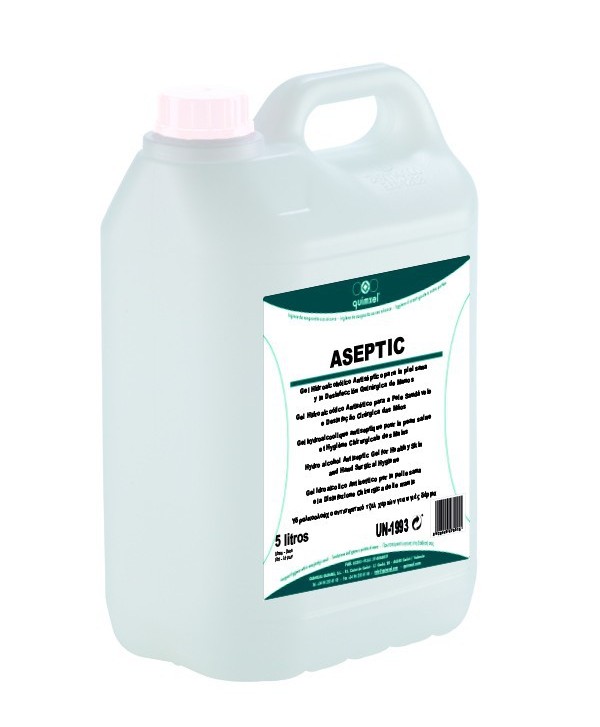 ASEPTIC es un gel hidroalcohólico antiséptico para uso profesional, indicado para la desinfección higiénica y prequirúrgica de manos sin aclarado. Su formato de 5 litros es ideal para centros sanitarios, colectividades e industria alimentaria.