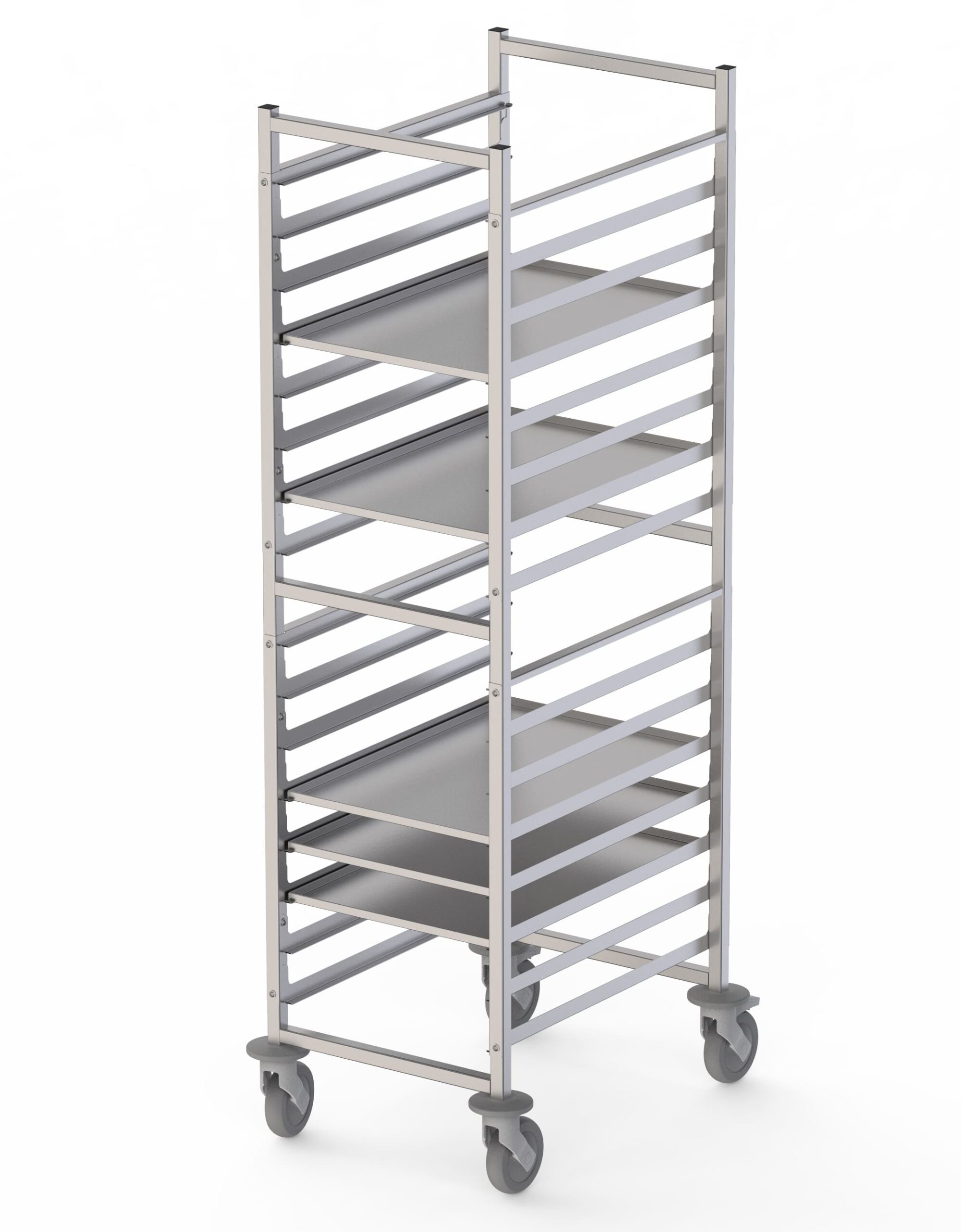 El carro bandejero TT16N600400 está diseñado para el almacenamiento y transporte de bandejas de 600×400 mm en entornos profesionales como panaderías, pastelerías, obradores, restaurantes y servicios de catering. Gracias a su diseño vertical, permite optimizar el espacio y mantener las bandejas perfectamente organizadas.