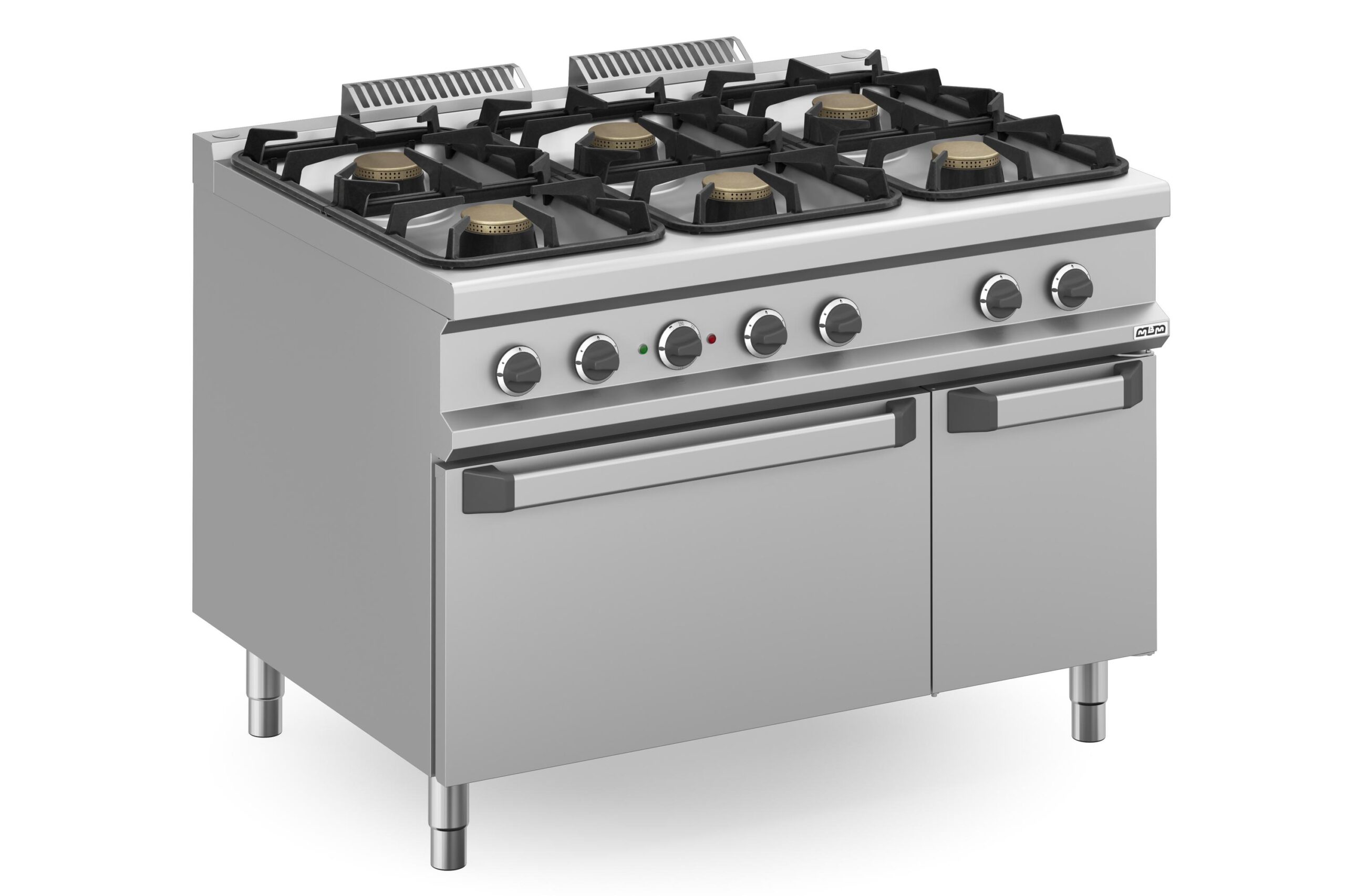 La Cocina a gas 6 fuegos con horno eléctrico MFB912AFEXXS Magistra Plus 900 de MBM es un equipo robusto y fiable, diseñado para las exigencias de la hostelería profesional. La encimera, fabricada en acero inoxidable AISI 18/10 de 1 mm de espesor, cuenta con seis quemadores Flex Burner de 5.5 kW, que ofrecen una cocción precisa y uniforme. Las rejillas de hierro fundido esmaltado son aptas para lavavajillas, facilitando enormemente su limpieza.
