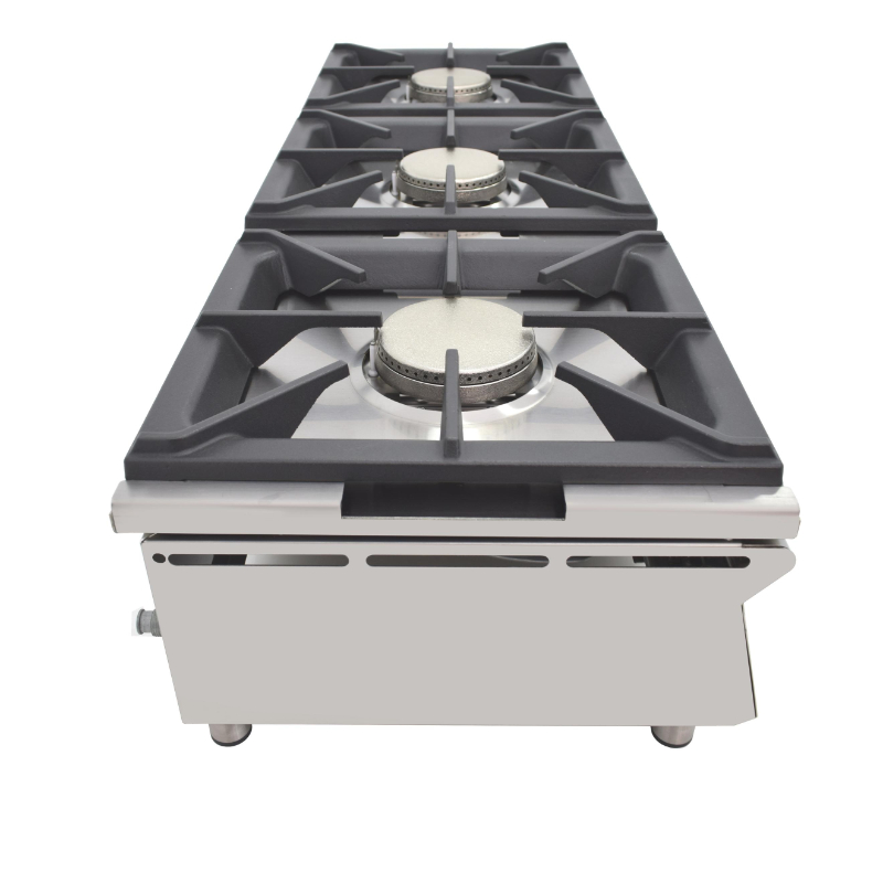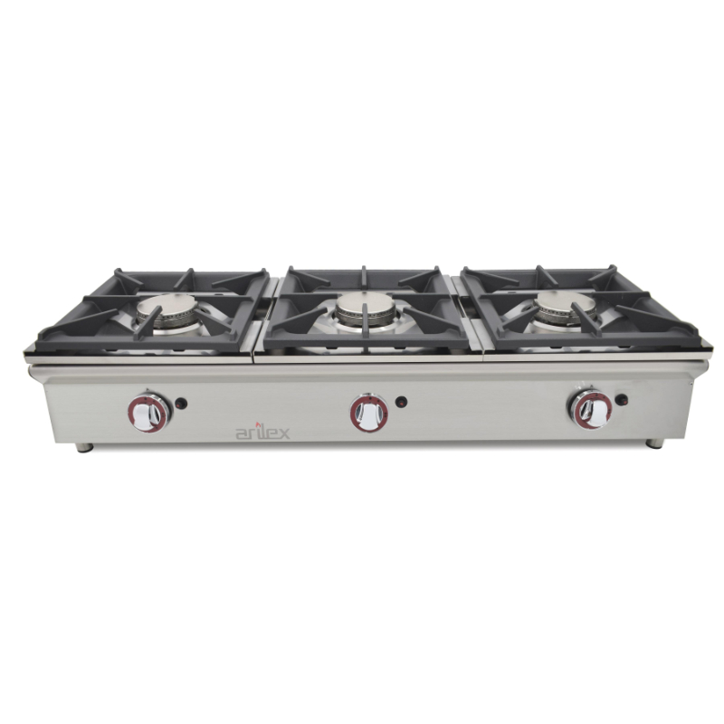 La Cocina a Gas Sobremostrador de Arilex, modelo 120CGN, es un equipo profesional de alto rendimiento y durabilidad, ideal para optimizar el espacio en cocinas de alto volumen. Fabricada en España con una estructura de acero inoxidable de 1 mm de espesor y acabado satinado, este equipo destaca por su robustez y su diseño funcional. Cuenta con tres potentes quemadores de 5.8 kW cada uno, con una alta eficiencia certificada del 60%, lo que garantiza una cocción rápida y eficaz. Las parrillas de hierro fundido son totalmente desmontables para facilitar la limpieza y, al igual que otros modelos de la marca, pueden ser reemplazadas por placas de acero laminado opcionales para convertir la cocina en una plancha.