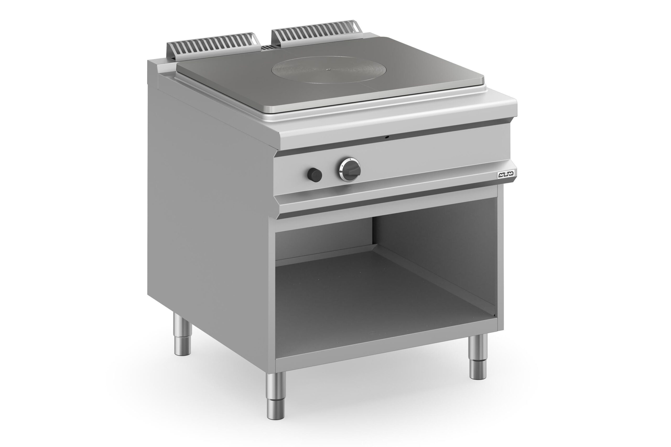 La Cocina de Plancha Radiante a Gas 80 cm con Mueble MTPG98A Magistra Plus 900 de MBM es una solución de cocción de alto rendimiento, ideal para cocinas profesionales. La plancha, de hierro fundido de 10 mm de espesor, tiene una superficie de 50 dm² y cuenta con un anillo central móvil que permite una distribución de calor óptima. El calentamiento se realiza mediante un potente quemador de acero de 12 kW ubicado debajo del anillo central, con un eficiente sistema de encendido piezoeléctrico y control termostático para una regulación precisa de la temperatura.