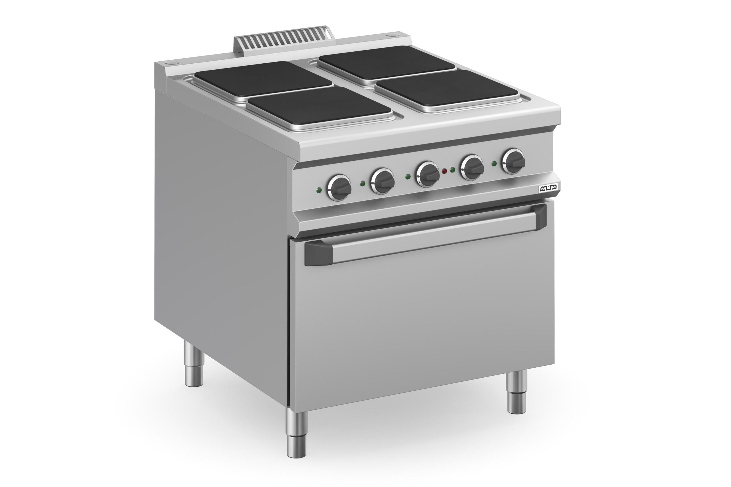 La Cocina eléctrica 4 zonas cuadradas con horno eléctrico MPQ98FE Magistra Plus 900 de MBM es una solución de cocción profesional completa y de alta calidad. La encimera de trabajo, fabricada en acero inoxidable AISI 18/10 de 1 mm de espesor, integra cuatro placas de hierro fundido de calentamiento rápido, que ofrecen una potencia combinada de 13.0 kW. Estas placas están selladas «herméticamente» para facilitar la limpieza y garantizar la higiene. El equipo cuenta con luces indicadoras en el panel de control para señalar el estado de funcionamiento de cada placa.