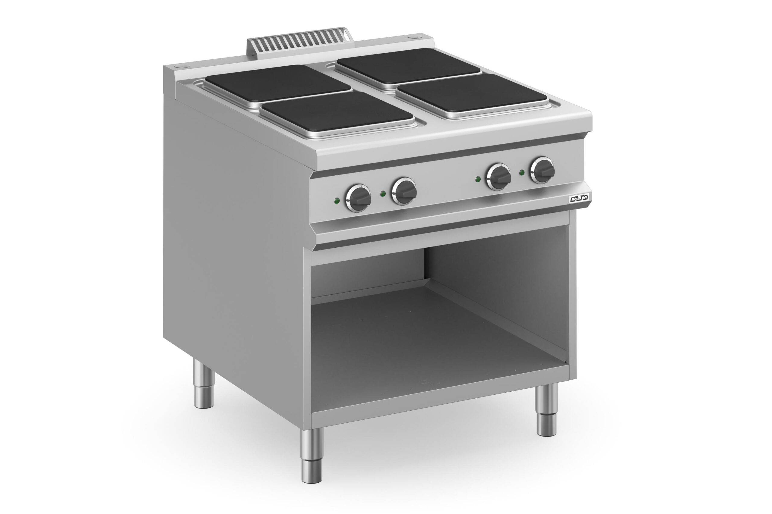 La Cocina eléctrica 4 zonas cuadradas con mueble MPQ98A Magistra Plus 900 de MBM es un equipo profesional diseñado para ofrecer un rendimiento superior y una gran durabilidad. La encimera de trabajo, fabricada en acero inoxidable AISI 18/10 de 1 mm de espesor, integra cuatro placas de hierro fundido de calentamiento rápido, que ofrecen una potencia total de 13.0 kW. Estas placas están fijadas «herméticamente» en la superficie, lo que facilita la limpieza y mejora la higiene.