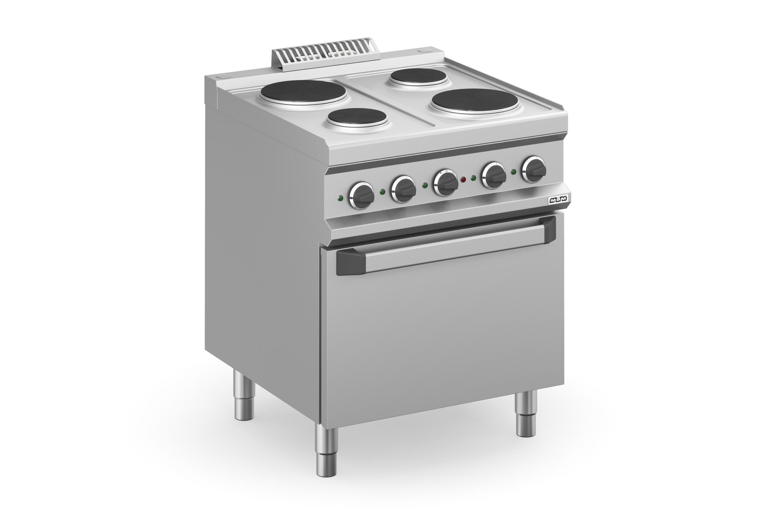 La Cocina Eléctrica 4 Zonas Redondas con Horno Eléctrico Estático MPR77FE Magistra Plus 700 de MBM es un equipo robusto y fiable, ideal para cocinas profesionales de gran volumen. Fabricada en Italia con una encimera de acero inoxidable AISI 18/10 de 1 mm de espesor, garantiza durabilidad y facilita la limpieza.