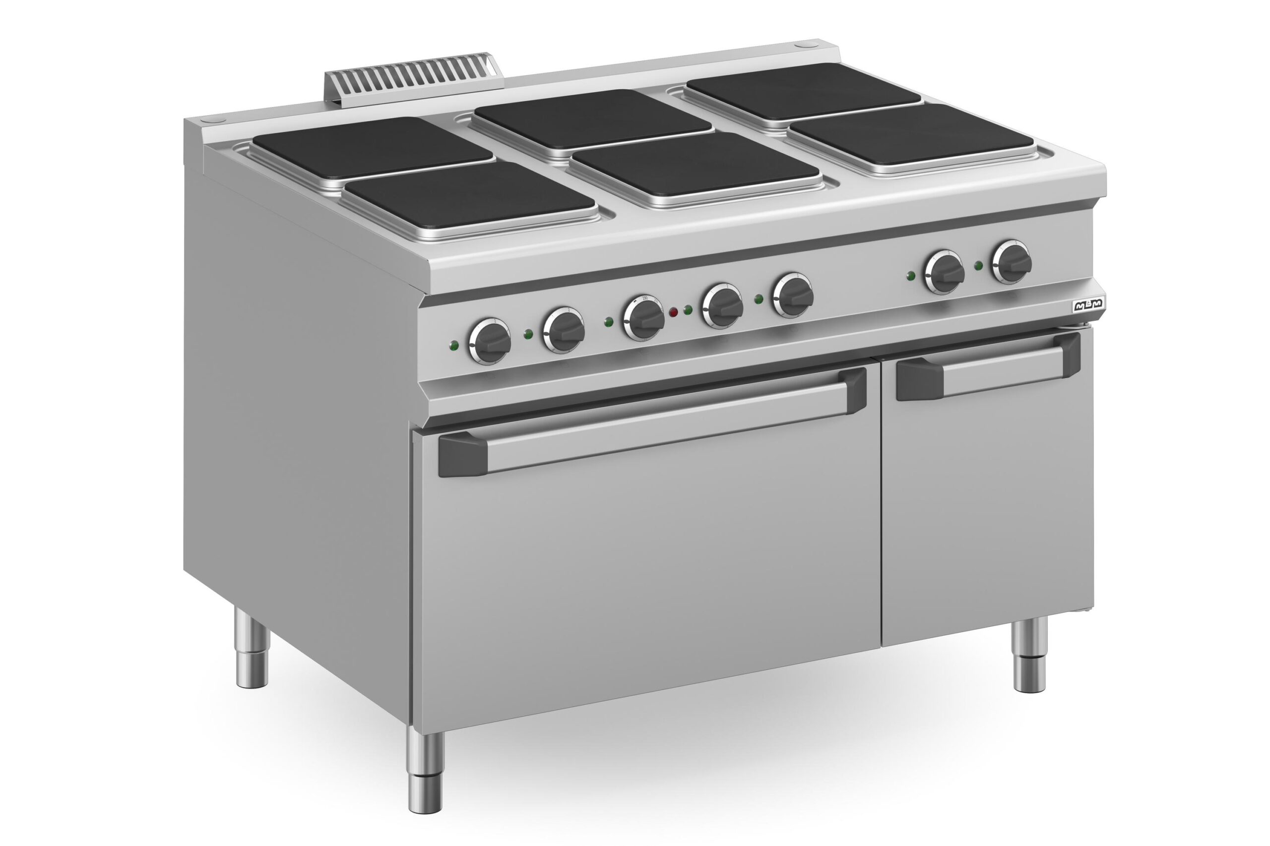 La Cocina eléctrica 6 zonas cuadradas con horno eléctrico MPQ912FE Magistra Plus 900 de MBM es un equipo robusto y eficiente, diseñado para satisfacer las demandas de las cocinas profesionales más exigentes. Su encimera de trabajo, fabricada en acero inoxidable AISI 18/10 de 1 mm de espesor, garantiza durabilidad y una limpieza sencilla. La superficie de cocción cuenta con seis potentes placas cuadradas de hierro fundido de calentamiento rápido, que están selladas «herméticamente» en la encimera. Con una potencia combinada de 20.0 kW para las placas, este equipo asegura un rendimiento excepcional.
