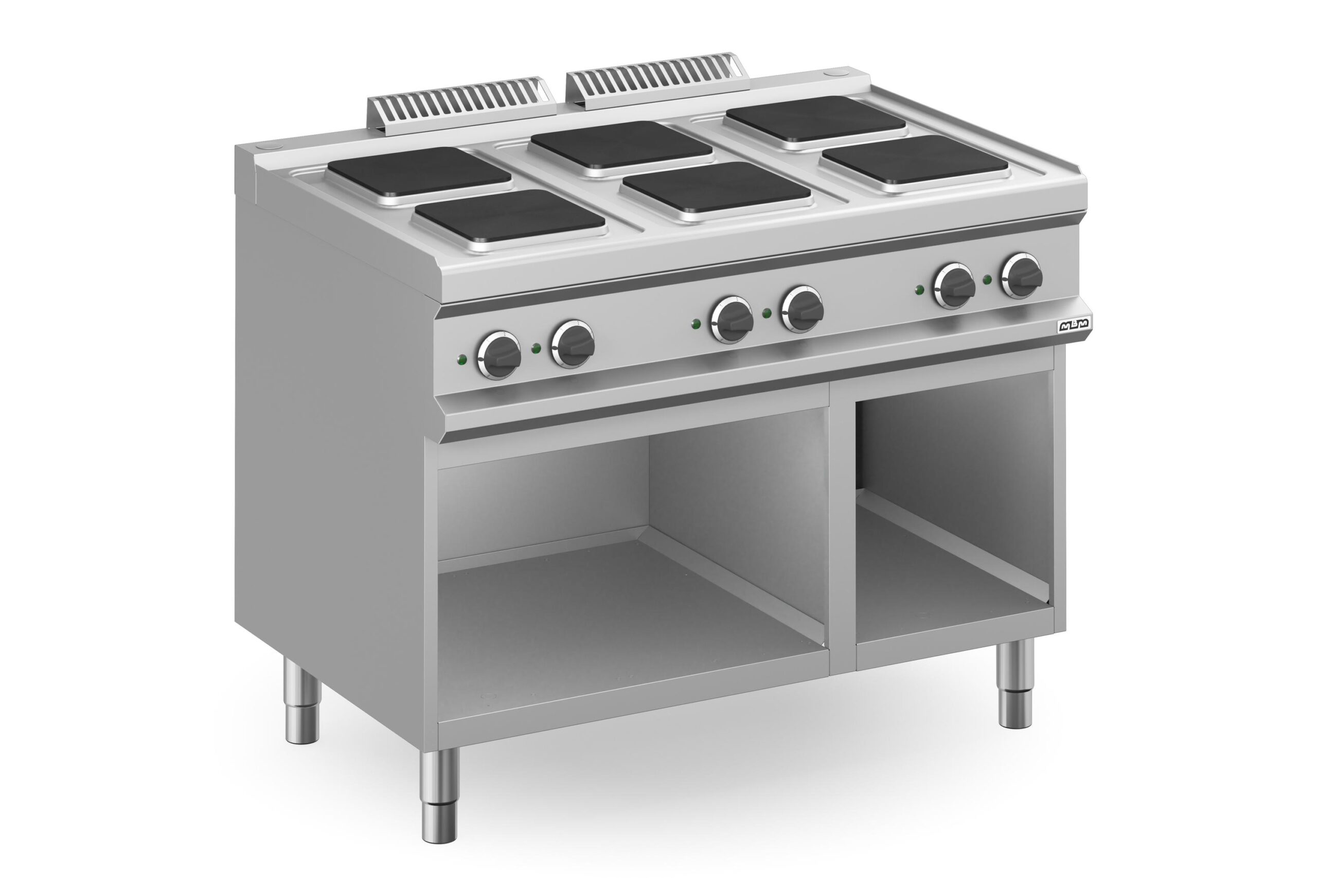 La Cocina Eléctrica 6 Zonas Redondas con Mueble MPR711A Magistra Plus 700 de MBM es un equipo indispensable para cocinas industriales que requieren una capacidad de producción masiva. Fabricada en Italia con una robusta encimera de acero inoxidable AISI 18/10 de 1 mm de espesor, esta cocina con mueble incorporado garantiza durabilidad, resistencia y una limpieza sencilla, cumpliendo con los estándares de higiene más exigentes.