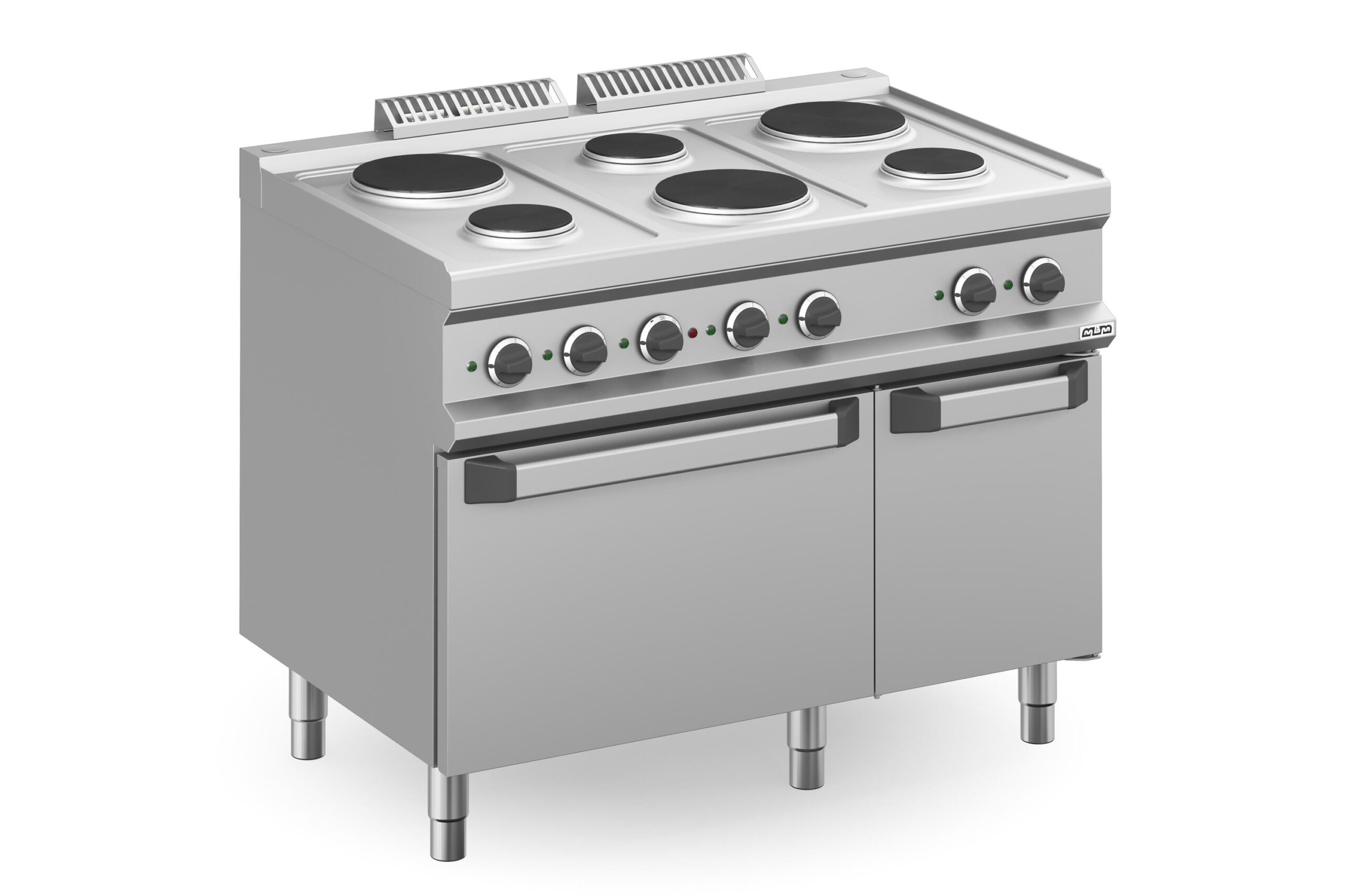 La Cocina Eléctrica 6 Zonas Redondas con Mueble MPR711A Magistra Plus 700 de MBM es un equipo indispensable para cocinas industriales que requieren una capacidad de producción masiva. Fabricada en Italia con una robusta encimera de acero inoxidable AISI 18/10 de 1 mm de espesor, esta cocina con mueble incorporado garantiza durabilidad, resistencia y una limpieza sencilla, cumpliendo con los estándares de higiene más exigentes.