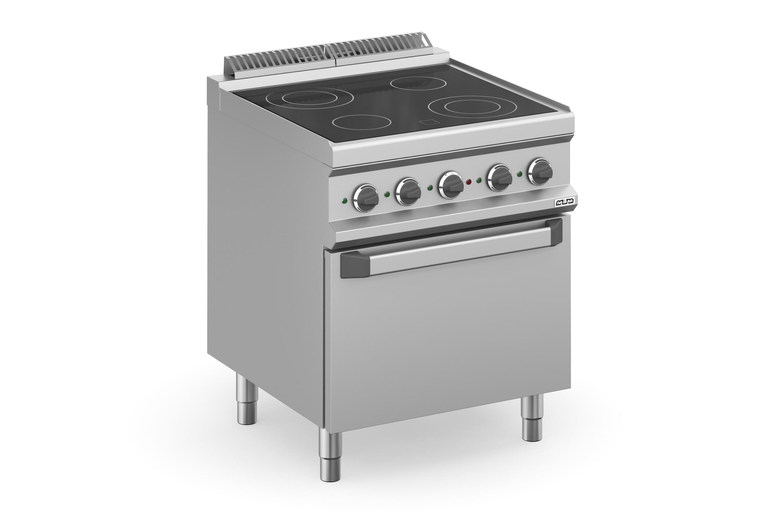 La Cocina Vitrocerámica Eléctrica 4 Zonas con Horno Eléctrico MVC77FE Magistra Plus 700 de MBM es un equipo robusto y fiable, diseñado para satisfacer las demandas de cocinas profesionales. Fabricada en Italia, su diseño combina la durabilidad de una estructura de acero inoxidable con la funcionalidad de una superficie de cocción de última generación y un potente horno.