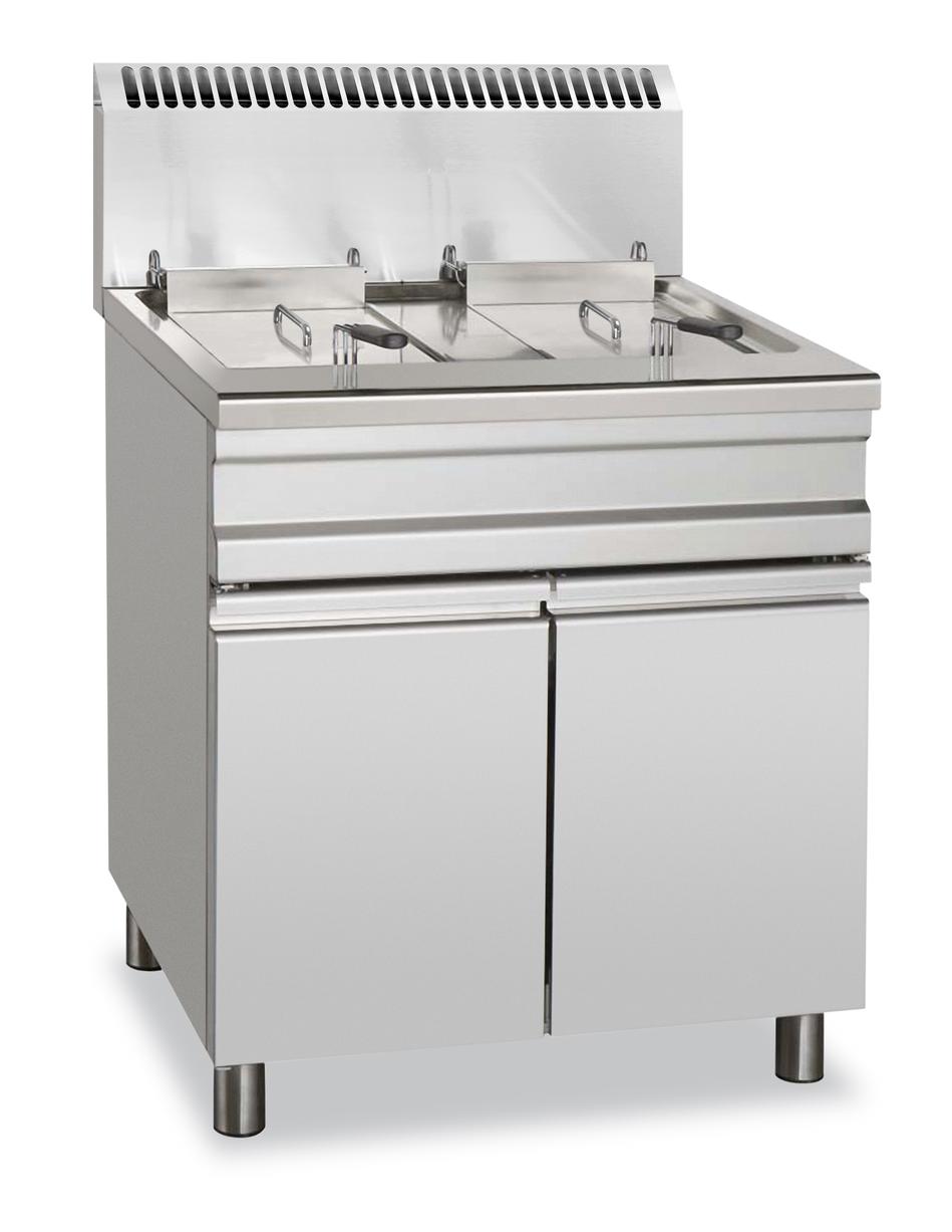 La Freidora a Gas 14+14 Litros 13+13 kW con Mueble GF15+15S STAND ALONE de MBM es una solución de alto rendimiento y doble cuba para cocinas profesionales que necesitan procesar grandes volúmenes de frituras. Su diseño con dos cubas independientes permite freír diferentes tipos de alimentos simultáneamente sin que se mezclen los sabores. La estructura, fabricada con una parte superior en acero inoxidable, garantiza durabilidad y una limpieza sencilla, cumpliendo con los estándares de higiene más exigentes.