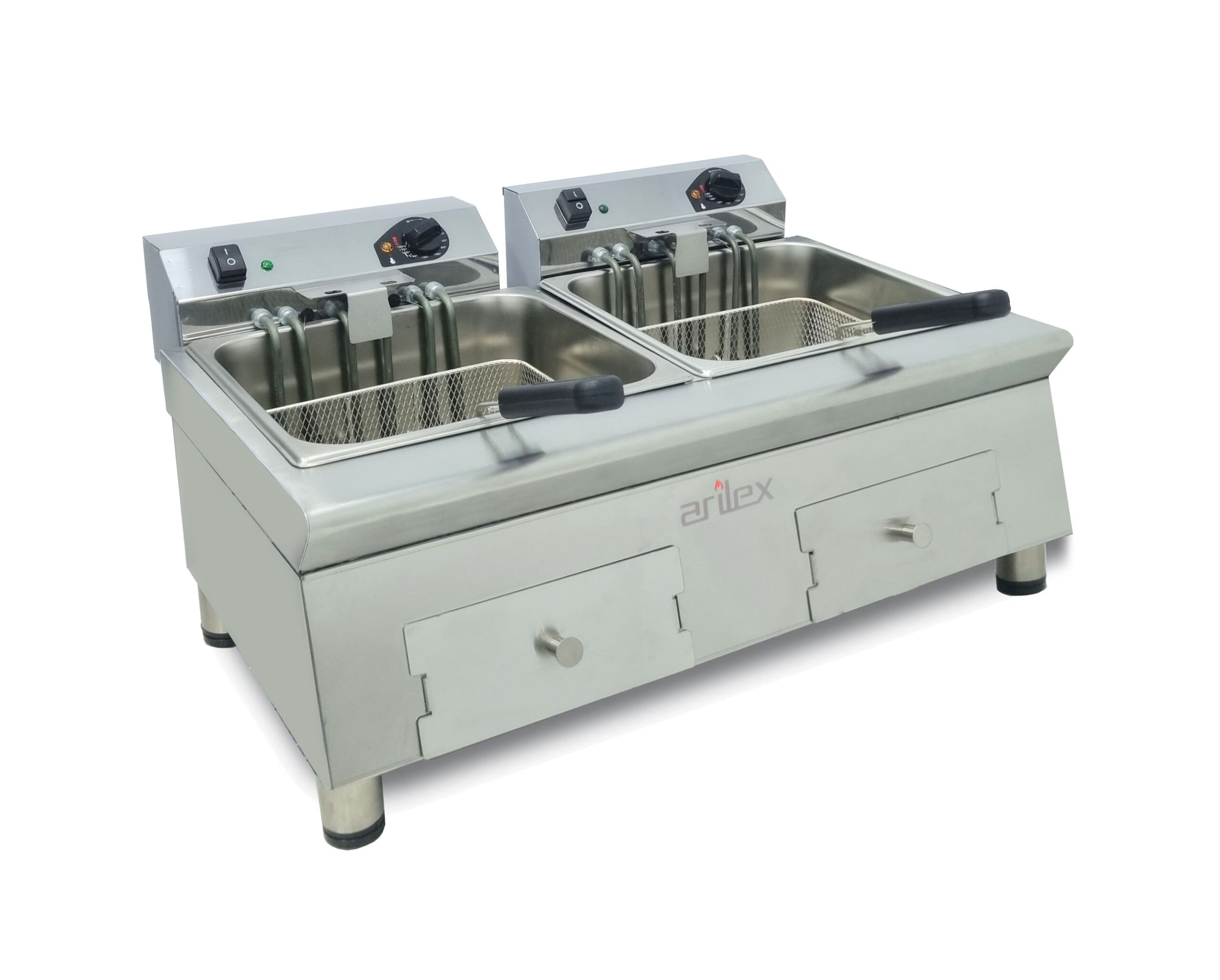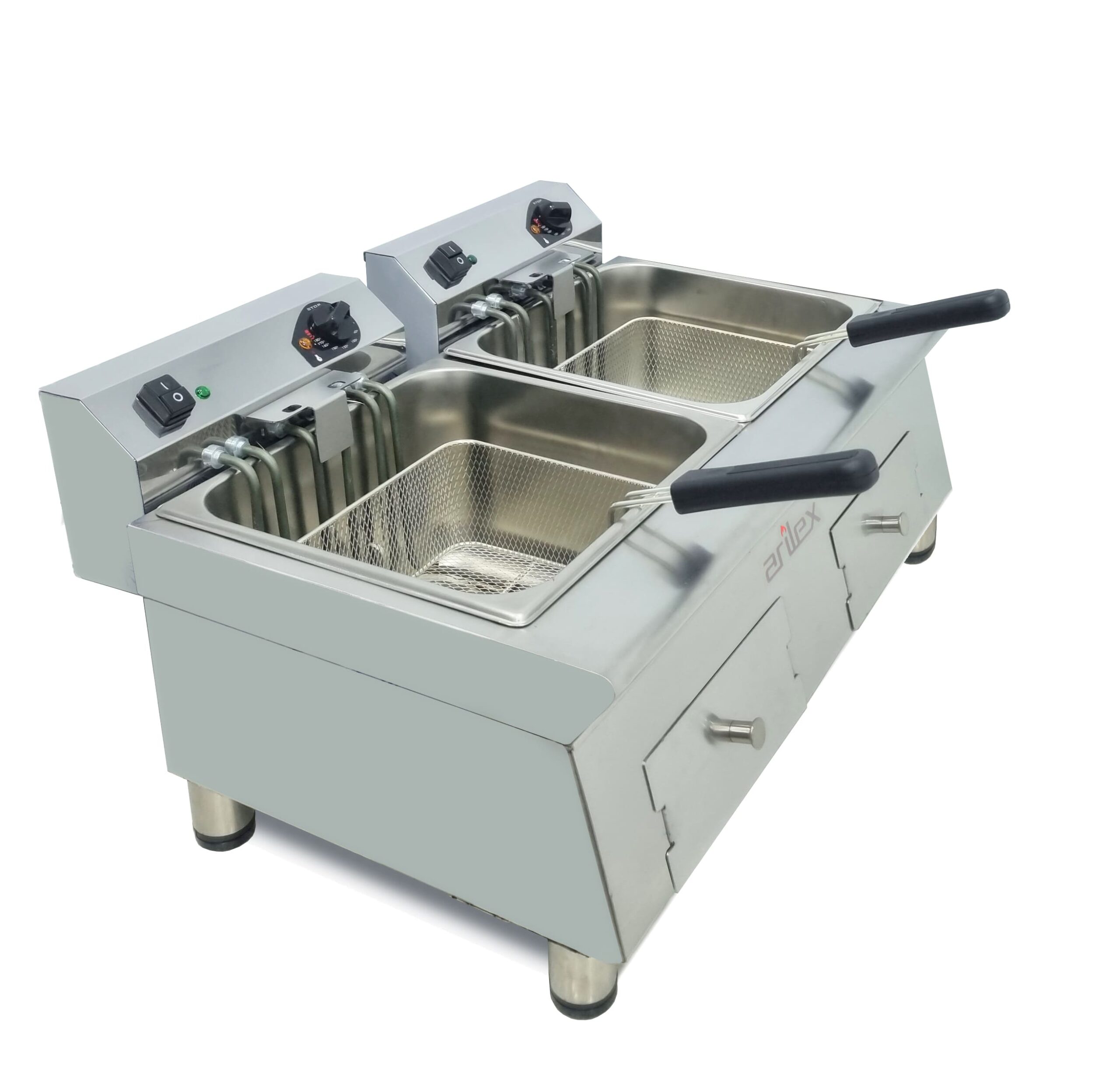 La Freidora Eléctrica Monofásica de 12+12 Litros de Arilex, modelo 70FRE1212G, es un equipo profesional de alta calidad, fabricado en España con acero inoxidable de 1.2 mm de espesor y acabado satinado. Su diseño modular con dos cubas de 12 litros cada una, permite freír grandes cantidades de forma independiente, optimizando el rendimiento en cocinas de alto volumen.