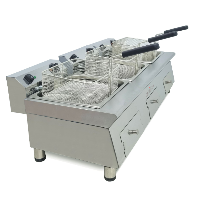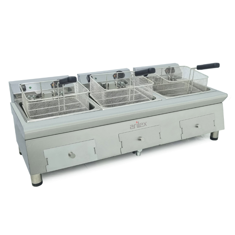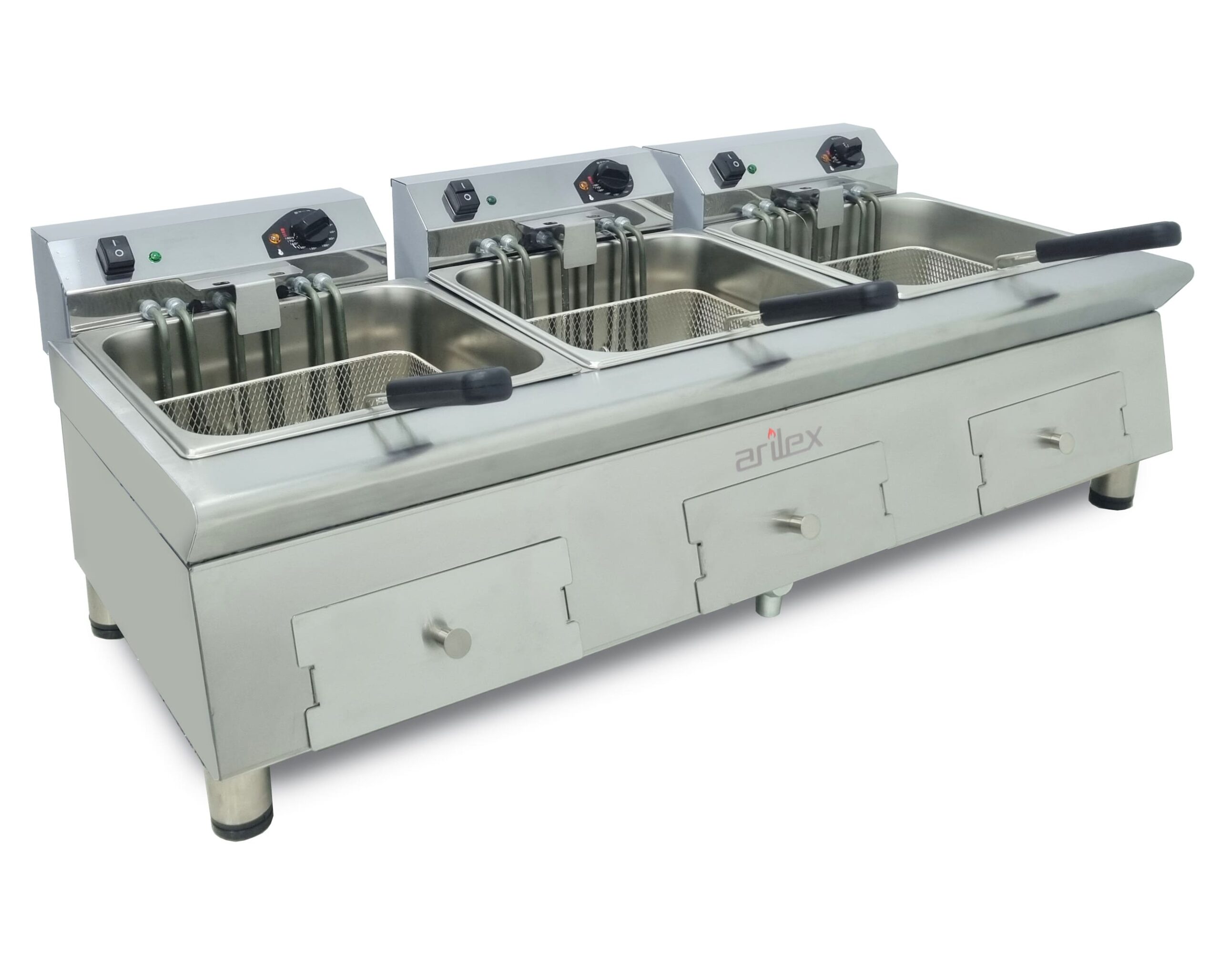 La Freidora Eléctrica Monofásica de 12+12+12 Litros de Arilex, modelo 100FRE121212G, es un equipo profesional robusto, fabricado en España con acero inoxidable de 1.2 mm de espesor y acabado satinado, lo que garantiza durabilidad y resistencia al uso intensivo. Su diseño de tres cubas independientes permite una gestión versátil de las frituras, evitando la mezcla de sabores entre los distintos alimentos. Cada cuba tiene una capacidad de 12 litros, con una capacidad útil de aceite de 10 litros.