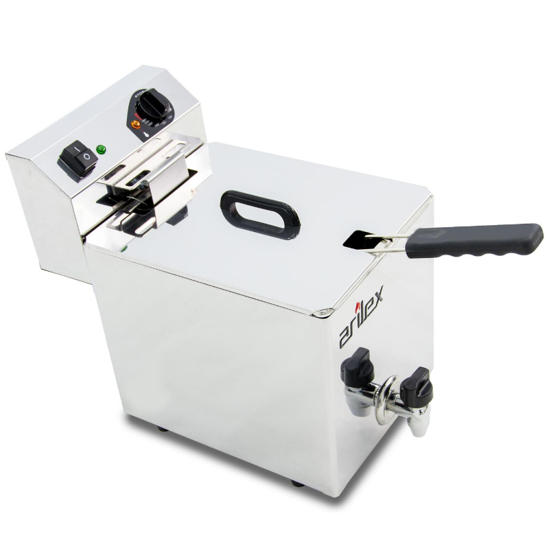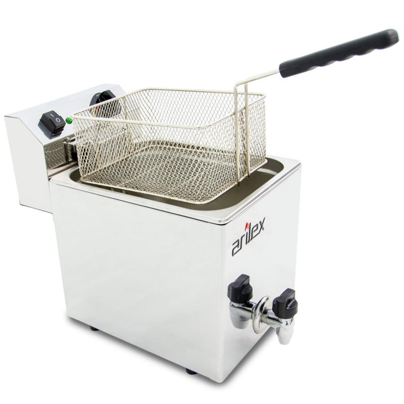 La Freidora Eléctrica Evolution Arilex EVO10G es un modelo industrial diseñado para la hostelería que combina alta eficiencia y funcionalidad. Fabricada en España con acero inoxidable de alto brillo, destaca por su durabilidad y la facilidad de limpieza. A diferencia del modelo EVO10, esta versión incorpora un grifo de vaciado con filtro anti-residuos, que permite un drenaje completo y sin obstrucciones del aceite, simplificando enormemente el mantenimiento diario.