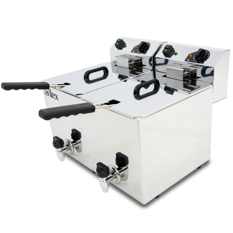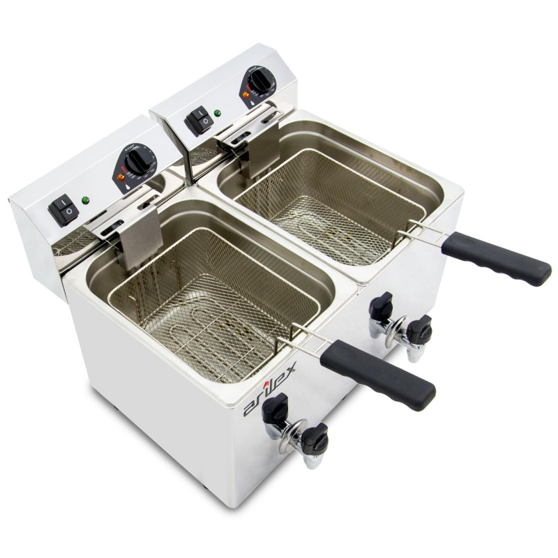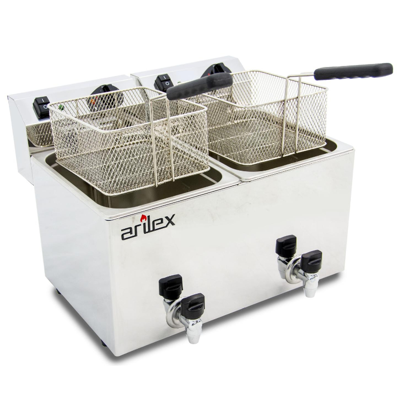 La Freidora Eléctrica Evolution Arilex EVO1010G es una freidora de sobremesa con doble cuba de 10 litros y grifo de vaciado. Con una potencia combinada de 7 kW, esta freidora está diseñada para satisfacer las demandas de cocinas profesionales con gran volumen de producción, permitiendo freír distintos alimentos de manera simultánea sin mezclar sabores y facilitando su limpieza.