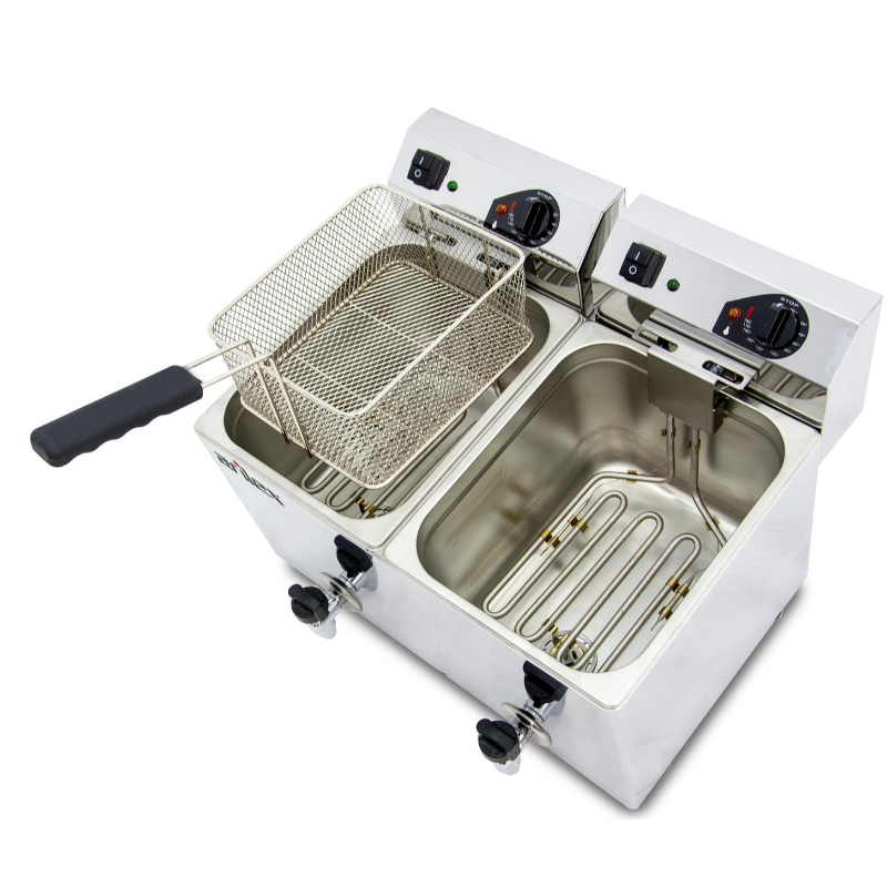 Ambas cubas cuentan con un grifo de vaciado en el fondo, equipado con un filtro anti-residuos para un drenaje completo y sin obstrucciones, lo que simplifica enormemente las tareas de limpieza. El cabezal eléctrico, estanco y extraíble, incorpora un microinterruptor de seguridad que desconecta la resistencia al ser retirado. La freidora incluye un termostato de trabajo regulable hasta 190°C y un termostato de seguridad con rearme manual a 240°C, asegurando un control preciso de la temperatura y una operación segura. Además, la «zona fría» debajo de la resistencia evita que los restos de alimentos se quemen, prolongando la vida útil del aceite y manteniendo la calidad de las frituras. El equipo viene con un contactor, que protege el termostato y mejora la fiabilidad general del producto.