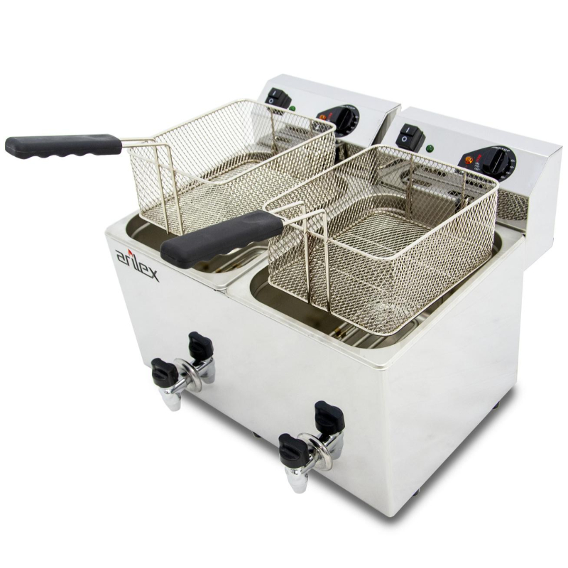 La Freidora Eléctrica Evolution Arilex EVO1010G es una solución industrial de alta gama, fabricada en España con acero inoxidable de alto brillo para garantizar durabilidad y resistencia en entornos de uso intensivo. Este modelo de doble cuba es ideal para optimizar la producción, ya que permite freír diferentes productos simultáneamente sin riesgo de transferencia de sabores, gracias a su diseño de cubas independientes.