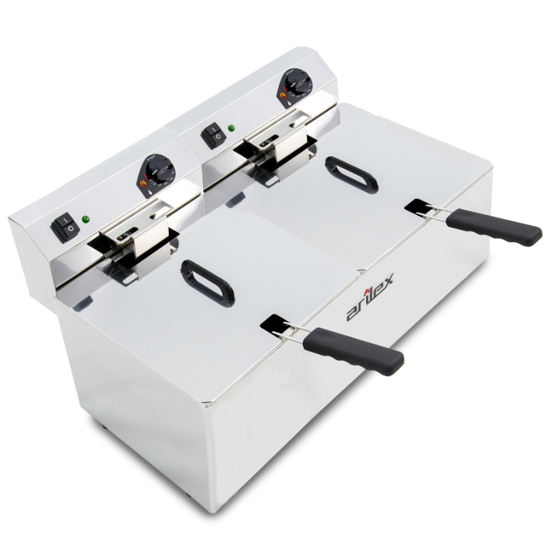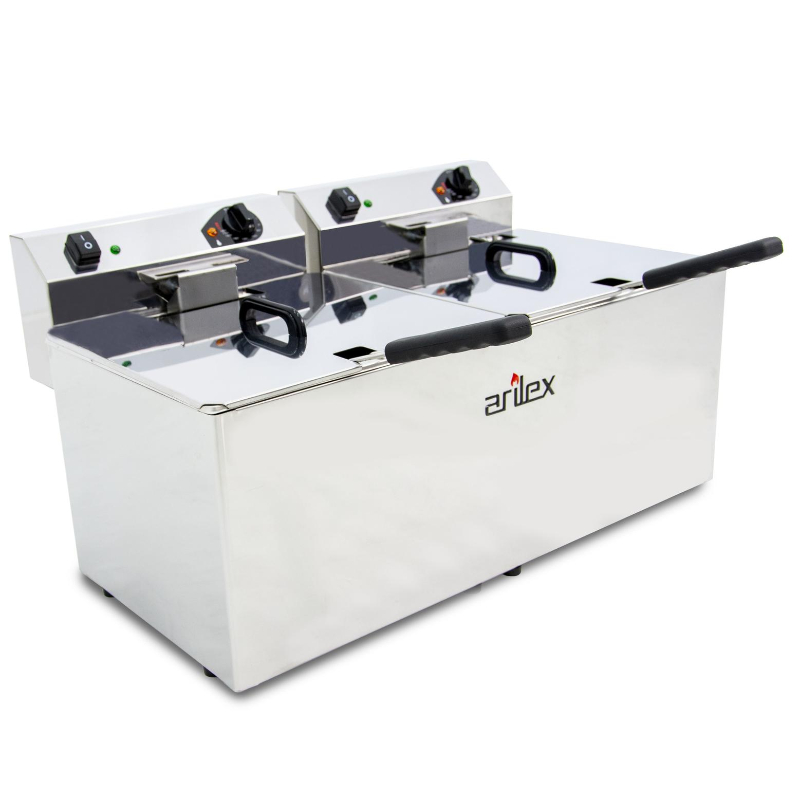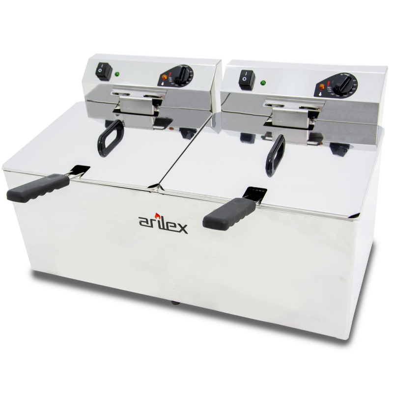 La Freidora Eléctrica Evolution Arilex EVO1212 es un modelo de sobremesa con dos cubas de 12+12 litros, ideal para freír grandes cantidades de alimentos de forma simultánea. Su potencia combinada de 9 kW y su robusta construcción la convierten en una solución de alto rendimiento para cocinas profesionales.
