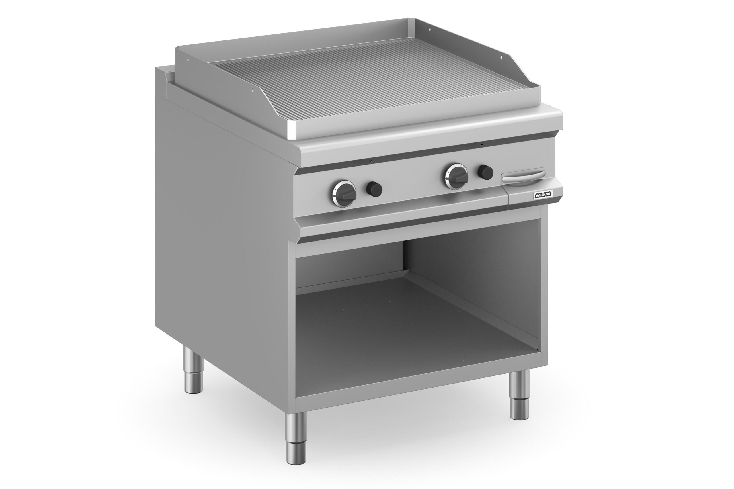 El calentamiento se realiza mediante dos quemadores de alta eficiencia, cada uno con encendido piezoeléctrico y control termostático que permiten una regulación precisa y fiable de la temperatura en las dos zonas de cocción. Para una mayor seguridad, el equipo está equipado con termopares de seguridad. Para facilitar la limpieza, incorpora un práctico cajón extraíble de acero inoxidable para la recogida de grasas y residuos, con una capacidad de hasta 2,5 litros.