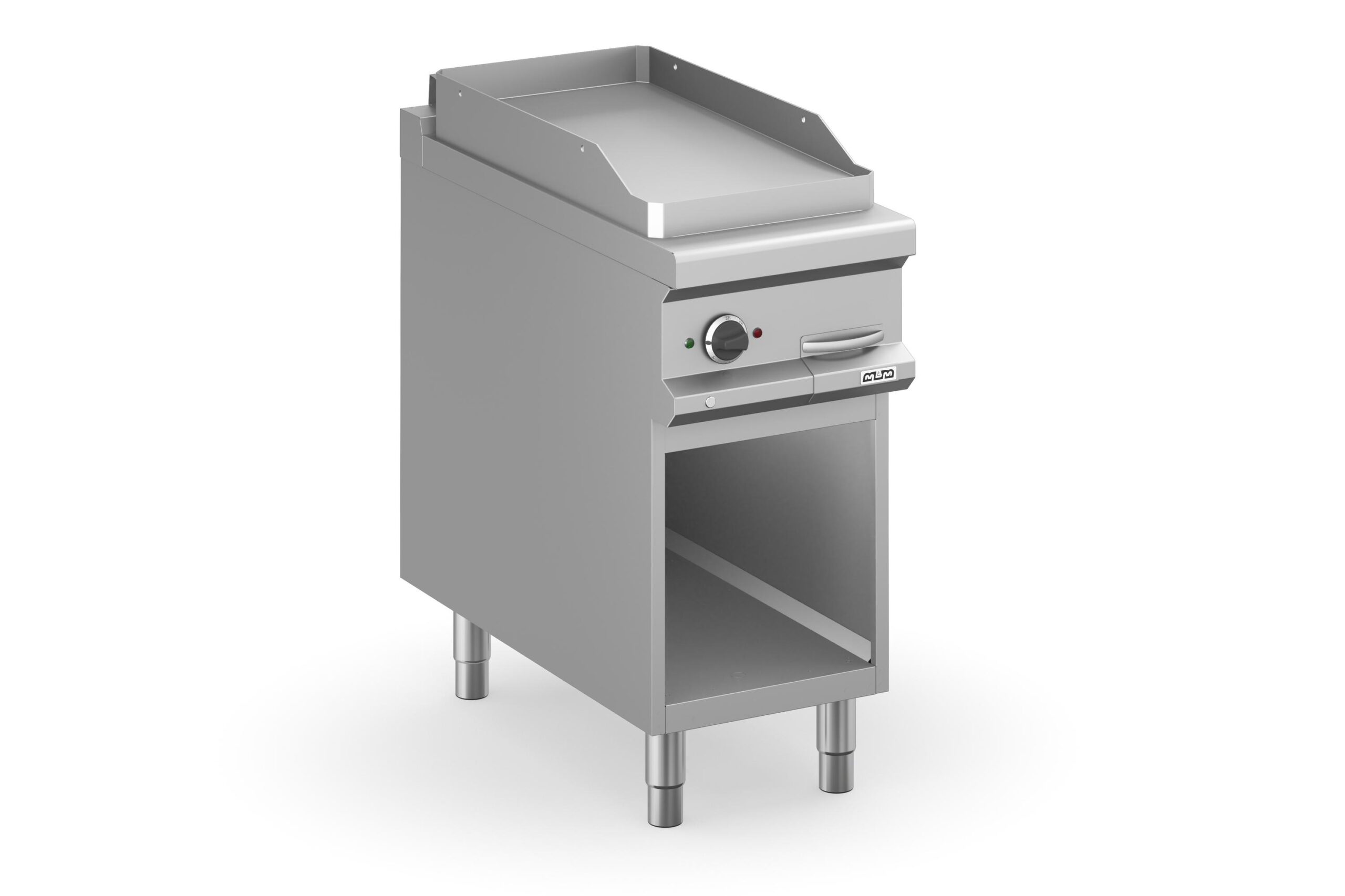 El Frytop Eléctrico de 40 cm con Placa Lisa de Acero Rectificado MFT E94AL Magistra Plus 900 de MBM es un equipo robusto y fiable, perfecto para cocinas profesionales que buscan eficiencia y control. La placa de cocción, de acero dulce rectificado con un espesor de 15 mm, está completamente encerrada en la encimera y garantiza una distribución homogénea del calor en toda su superficie útil de 380 x 720 mm.