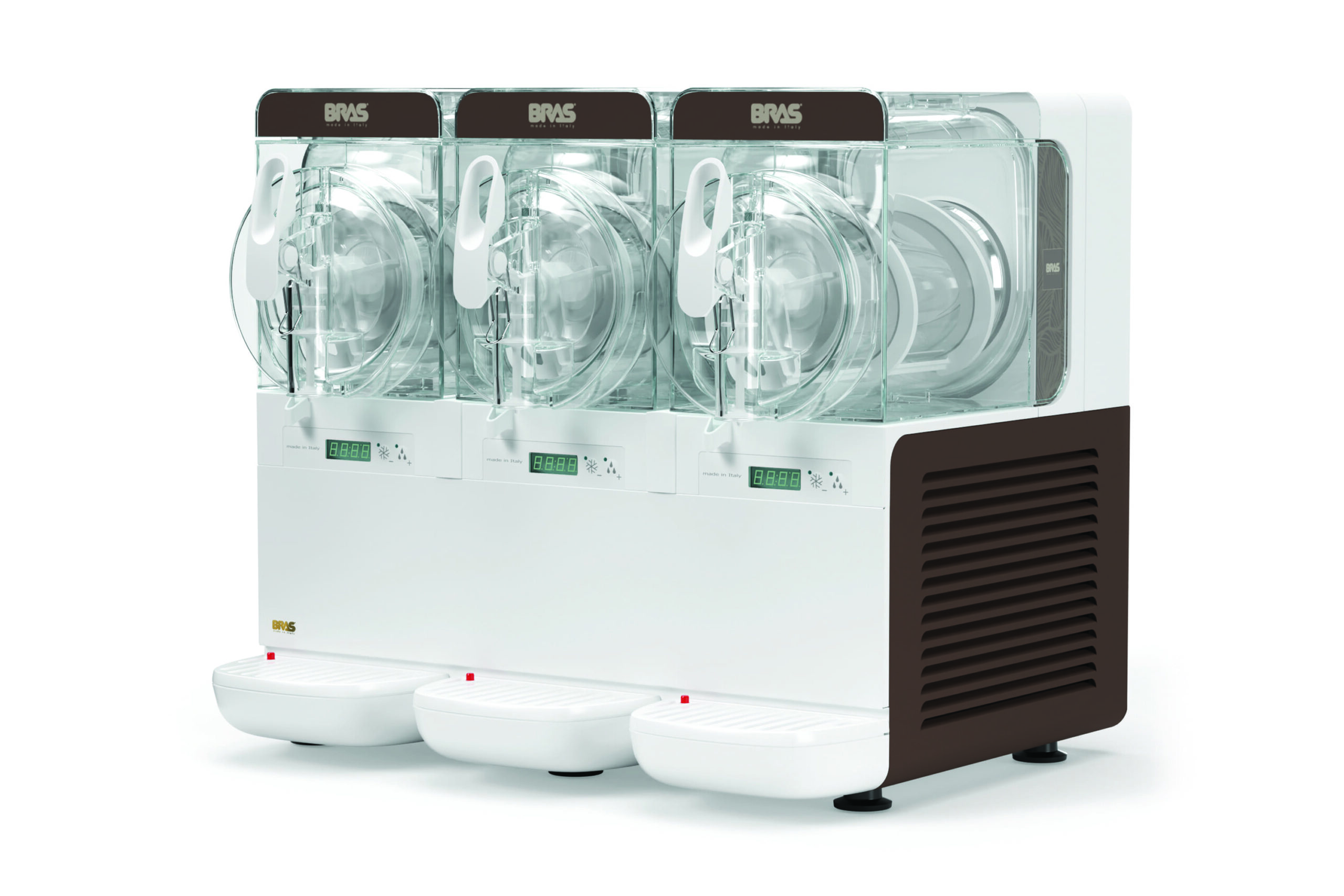 La Granizadora BRAS B-CUBE3 es la opción más completa de la gama B-CUBE, diseñada para negocios del sector de la hostelería que buscan la máxima variedad y eficiencia en un espacio compacto. Es considerada la granizadora profesional más pequeña del mundo en su versión de tres cubas, lo que la convierte en una «máquina boutique» con un diseño elegante y funcional. Sus tres cubas independientes de 2.8 litros cada una permiten preparar y servir tres sabores distintos de granizados, sorbetes o cremas frías al mismo tiempo.