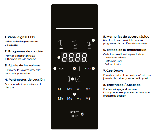 Fabricado con materiales de alta calidad y pensado para el uso intensivo en hostelería, este horno ofrece una estructura robusta, interior de fácil limpieza y un diseño compacto que optimiza el espacio de trabajo en la cocina.