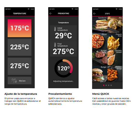 La tecnología Impingement proyecta aire caliente a gran velocidad directamente sobre el alimento mientras la convección mantiene una temperatura constante dentro de la cámara. Este sistema permite reducir considerablemente los tiempos de cocción manteniendo siempre una calidad homogénea.