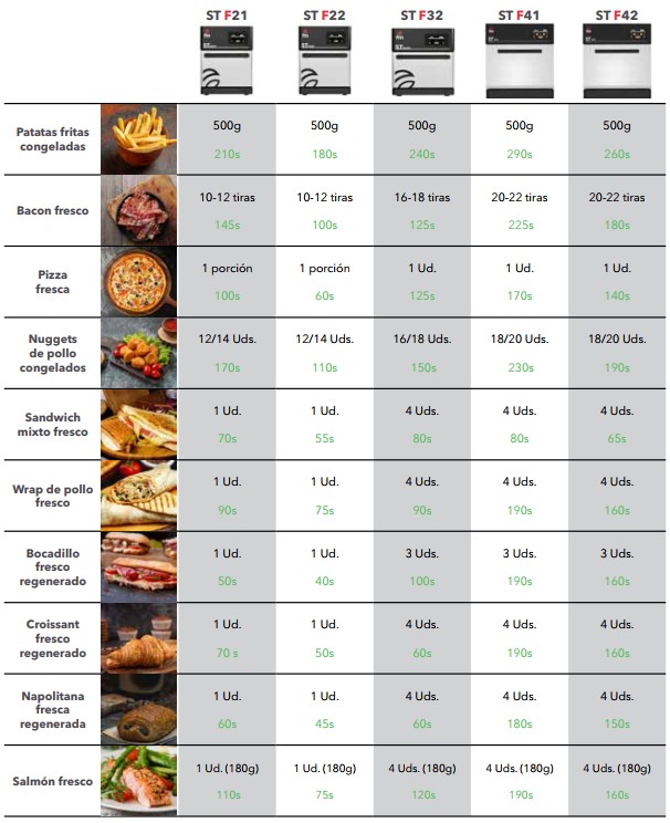 El ST-F42 permite trabajar con hasta 3 bandejas de 430 x 340 mm en modo convección, lo que incrementa la capacidad de producción durante las horas de mayor demanda. Esta característica lo convierte en una solución ideal para establecimientos con alto volumen de pedidos. :contentReference[oaicite:2]{index=2}