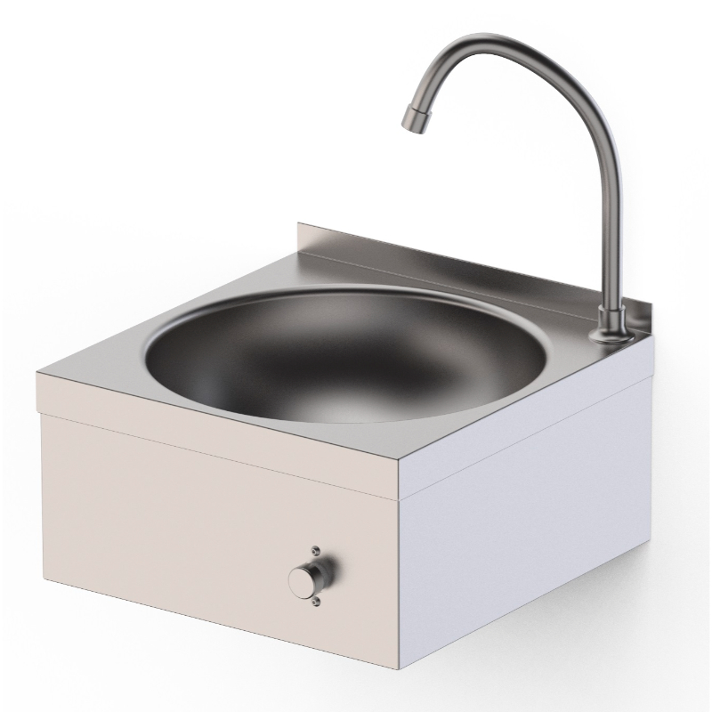 El Lavamanos Mural HWW14040000 es una solución funcional y que ahorra espacio, diseñada para cocinas industriales, hospitales, talleres y cualquier negocio que necesite un punto de lavado compacto y robusto. Fabricado en acero inoxidable AISI 304 con un acabado satinado, este lavamanos es extremadamente duradero, resistente a la corrosión y fácil de limpiar, lo que garantiza el cumplimiento de los más altos estándares de higiene. Su diseño para montaje en pared libera espacio en el suelo, facilitando la limpieza del área y optimizando la distribución en espacios reducidos. Además, su sistema de pulsador automezclador permite regular la temperatura del agua de manera conveniente y sin necesidad de contacto manual prolongado, minimizando el riesgo de contaminación cruzada. Es una opción práctica y eficaz para mantener la limpieza personal de los trabajadores, sin sacrificar espacio ni durabilidad.