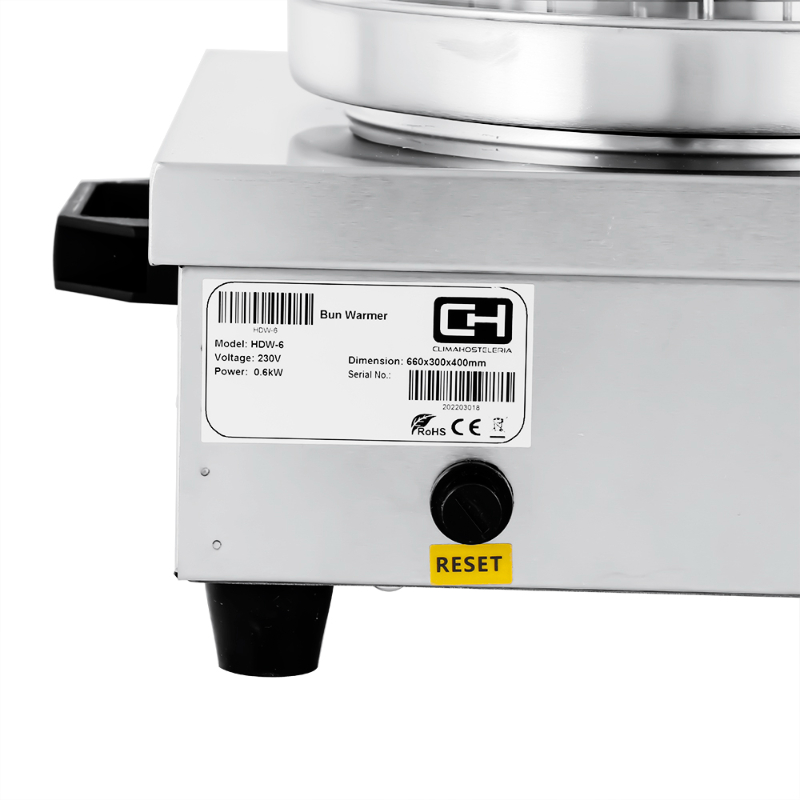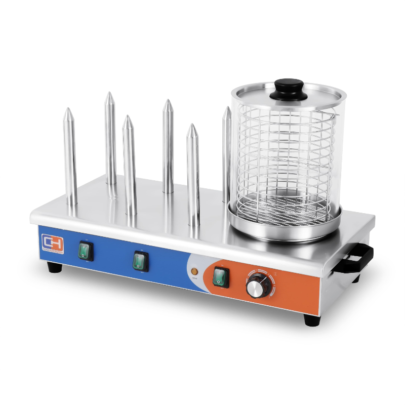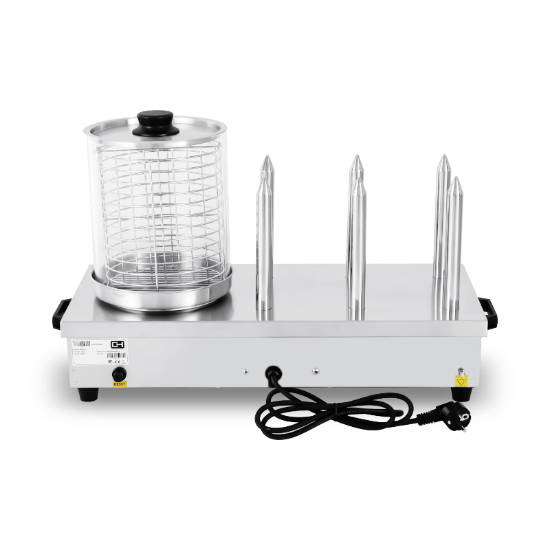La Máquina de Perritos Calientes Línea PEKÍN HDW-6 es la versión de mayor capacidad en su serie, diseñada para calentar salchichas y panecillos simultáneamente. Con seis pinchos para el pan y un cilindro de vidrio templado para las salchichas, es una solución de alto rendimiento para negocios de hostelería, catering y eventos con una gran demanda de perritos calientes. Su construcción en acero inoxidable garantiza higiene y durabilidad.