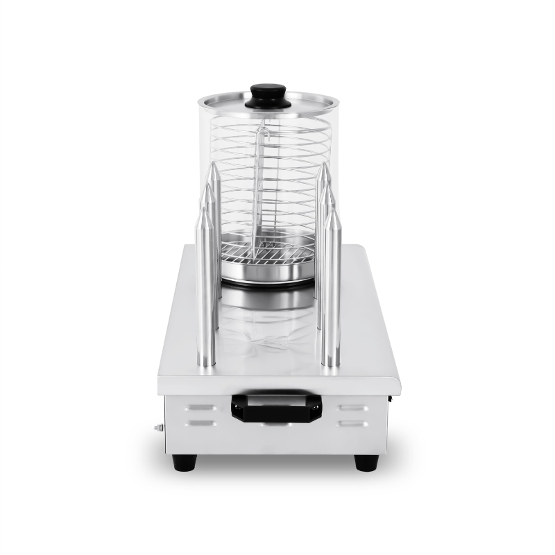 La Máquina de Perritos Calientes Línea PEKÍN HDW-6 es una herramienta indispensable para establecimientos que buscan un rendimiento superior en la preparación de perritos calientes. Su estructura, fabricada íntegramente en acero inoxidable, asegura una máxima robustez, durabilidad e higiene, cumpliendo con los estándares más exigentes del sector. El cilindro de vidrio templado, resistente a altas temperaturas, permite calentar hasta 30 salchichas de manera uniforme mediante vapor de agua, manteniendo su textura y sabor intactos. Este modelo se distingue por sus seis pinchos, que permiten tostar un mayor número de panecillos de forma simultánea, optimizando el servicio en momentos de alta demanda. Equipada con un termostato regulable de 40 a 100 °C, un piloto indicador y un doble interruptor para controlar por separado los pinchos y el escaldado, ofrece una operación flexible y segura. Además, cuenta con asas aislantes del calor y pies de goma antideslizantes para una manipulación segura y una estabilidad perfecta en la superficie de trabajo.