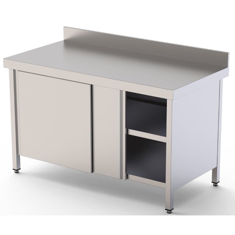 La Mesa de Trabajo Mural es una mesa de trabajo profesional de acero inoxidable AISI 304, ideal para su instalación junto a una pared en cocinas industriales. Su diseño incluye un estante inferior cerrado con una puerta corredera en una de las caras, lo que la hace perfecta para almacenar equipos o ingredientes de manera segura y discreta.