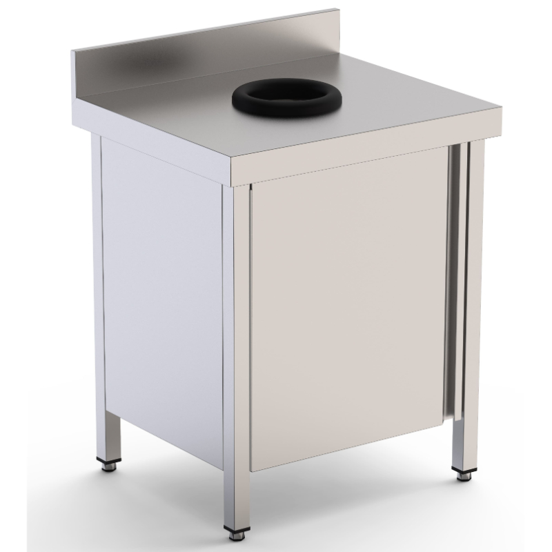 La Mesa de Trabajo Mural WTW170070WD es un elemento de mobiliario esencial para la eficiencia y la higiene en cocinas profesionales. Su construcción en acero inoxidable AISI 304 garantiza una excelente resistencia a la corrosión y una larga vida útil. La encimera de acero inoxidable satinado proporciona una superficie de trabajo sólida y estable. La principal característica de este modelo es la inclusión de un aro desbarazado integrado en la encimera, que permite desechar los residuos de forma rápida y directa en un recipiente colocado en el interior de la mesa. El compartimento inferior cuenta con una puerta que puede ser montada con apertura a la izquierda o a la derecha, según las necesidades del espacio. Las patas, fabricadas en tubo cuadrado de 40×40 mm en acero inoxidable, son regulables en altura, lo que permite adaptar la mesa a diferentes superficies y necesidades, garantizando una estabilidad perfecta. La mesa se suministra desmontada para un transporte y montaje más sencillos.