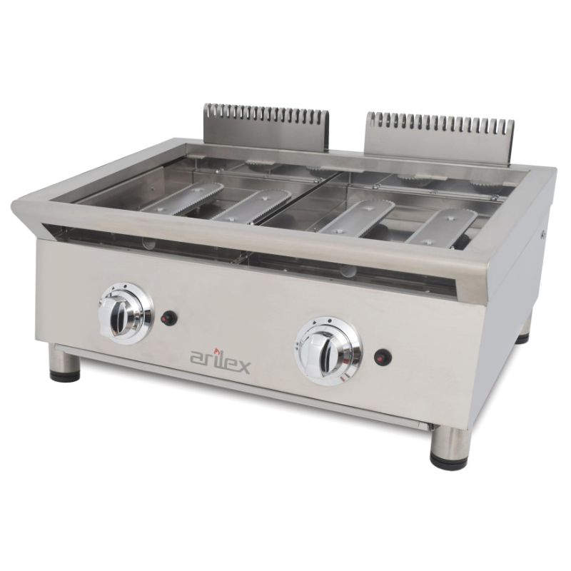 Una de sus características más innovadoras es el quemador diseñado por Arilex, que distribuye la llama por todo su perímetro para asegurar un calor uniforme y eliminar las «zonas frías» en la superficie. Con una potencia de 11.6 kW, proporciona un alto poder calorífico. Su diseño inteligente incluye una grasera frontal de gran capacidad, fácilmente extraíble para una limpieza sencilla, y controles de aleación de zinc de alta calidad. Se suministra para gas propano-butano, con inyectores adicionales para su conversión a gas natural. Además, su toma de gas trasera facilita la instalación, optimizando el espacio en la cocina. El mueble es el complemento ideal para cocinas industriales que buscan rendimiento, seguridad y flexibilidad.
