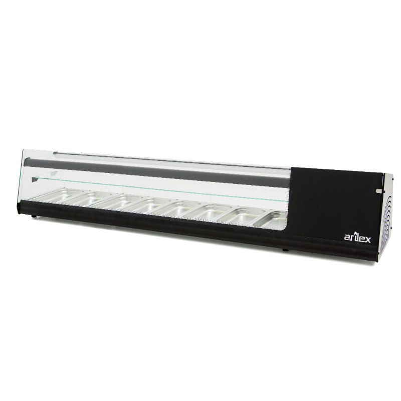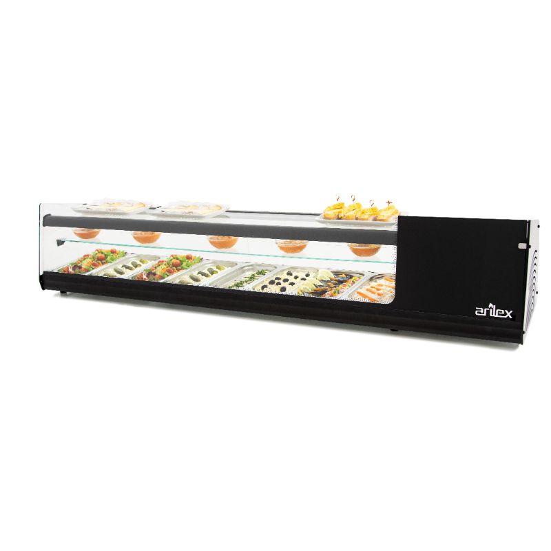 La Vitrina Refrigerada de Tapas Arilex, modelo 8VTG-NE TRIPLE, es un equipo fabricado en España que redefine la exposición de alimentos en el sector HORECA. Su característica más distintiva es el diseño de tres pisos con estantes intermedio y superior de cristal templado, que no solo aumentan la capacidad, sino que también mejoran la visibilidad de los productos.